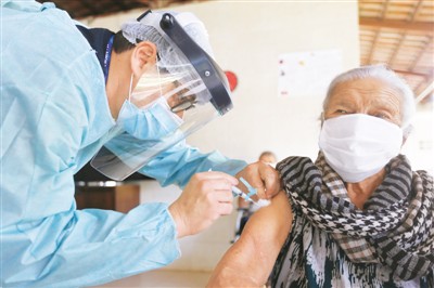 图为1月22日,在巴西首都巴西利亚的一家福利院,医护人员为老人接种新冠疫苗。巴西国家卫生监督局1月17日宣布,给予中国北京科兴中维生物技术有限公司研发的新冠疫苗克尔来福紧急使用许可。巴西1月18日正式开始全国新冠疫苗接种,生活在福利院的老人在首批接种人群范围内。卢西奥·塔沃拉摄(新华社发)